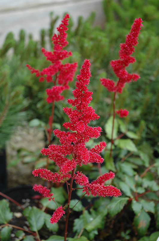 Burgundy Red Astilbe is a fine choice for the garden, but it is also a good selection for planting in outdoor pots and containers. With its upright habit of growth, it is best suited for use as a 'thriller' in the 'spiller-thriller-filler' container combination; plant it near the center of the pot, surrounded by smaller plants and those that spill over the edges. Note that when growing plants in outdoor containers and baskets, they may require more frequent waterings than they would in the yard or garden.