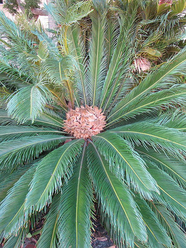 Japanese Sago Palm features showy spikes of tan flowers rising above the foliage in mid fall. Its attractive large narrow pinnately compound leaves emerge chartreuse in spring, turning green in color the rest of the year.