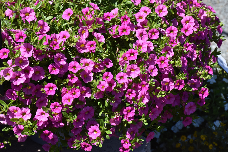 MiniFamous® Neo Pink Calibrachoa is smothered in stunning pink trumpet-shaped flowers with yellow throats at the ends of the stems from late spring to early fall. Its small pointy leaves remain green in color throughout the season.